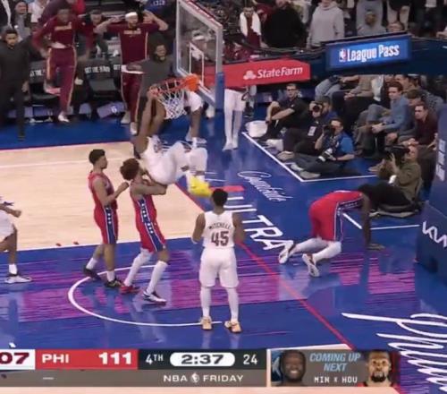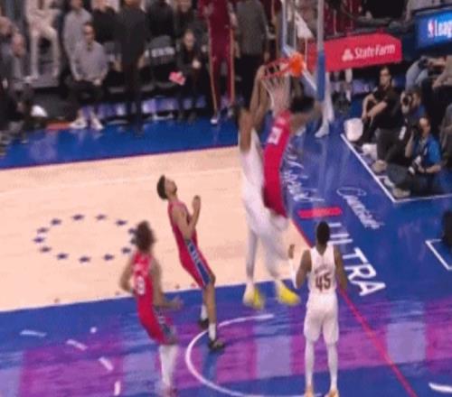 这球是真的炸裂亨特快攻中起飞骑扣恩比德大帝跪倒在地