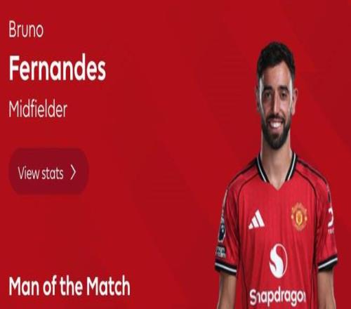 英超第22轮曼市德比,曼联主场2-0击败曼城,此役送出助攻的曼联队长布鲁诺-费尔南德斯当选全场最佳球员。
