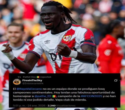 报道称,尽管这位塞内加尔球员未就此事发表正式声明,但西斯通过社交媒体表达了不满。西斯用其认证账号转发了一条推文,内容写道:“巴列卡诺并不是一支常出洲际冠军的球队。今天他们本有绝佳机会向非洲杯冠军西斯致敬,却连他妈的这个细节都没做到。真是个垃圾俱乐部。”