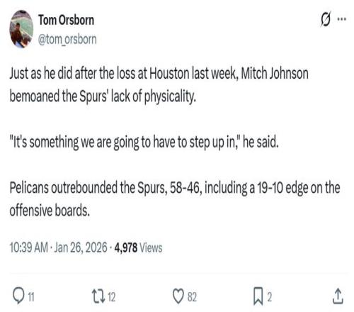 结果这一场本应一边倒的强弱对话爆出大冷门,马刺队95-104不敌鹈鹕队一口气暴露出3大问题。