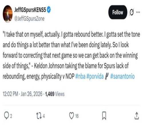 凯尔登约翰逊给出相同说法,主动揽责道:“实话实说,我把这归咎于自己,必须在篮板上做得更好,我要主动为球队定下基调,在各个方面都要做得更好,我已经开始期待下一场比赛中纠正这些问题,这让我们才能重新回到胜利的轨道上。”